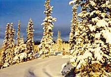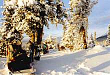 In einer tief verschneiten faszinierenden Winterlandschaft zogen wir unsere Bahnen durch den Neuschnee. Nun ging es zackiger zu, und die Hügel entwickelten sich schon zu richtigen Anstiegen, dazu auch noch der frisch gefallene Schnee, der die Arbeit für Hund und Mensch noch erschwert. Bäche von Schweiß brachen aus allen Poren hervor, und das Atmen entwickelte sich am Berg zu einer gewaltigen Hechelei. Das Schnaufen und Schnauben war schlimmer als das einer Dampflok. Aber die herrliche Natur um uns herum und die Pfade waren Entschädigung genug für die Plagerei! Wir tauchten tief in die Wälder ab, wohin man sonst als Tourist im Sommer vermutlich nicht so ohne weiteres kommt. So ungefähr 15 Km pro Stunde ist so ein Gespann schnell, und nach drei Stunden Fahrt ist man von jeglicher Art Zivilisation abgeschnitten. Die Vorstellung, wie auf Trappers Spuren durch die Wildnis zu ziehen, war schon eine reizvolle Geschichte für mich, ein bisschen Abenteuergeist war schließlich nicht zu leugnen. Ehrlich gesagt, freute ich mich jedes mal, wenn ich wieder auf dem Schlitten stand, denn das war die einzige Zeit, wo man wirklich mal für sich allein sein konnte.